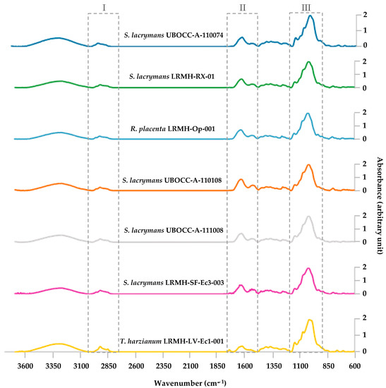 In this study, the application of FTIR spectroscopy to the identification and discrimination of S. lacrymans strains was evaluated. Reference FTIR spectra were made from different strains of S. lacrymans, R. placenta and T. harzianum after growth under standardised conditions. The analysis was carried out using a wide spectral range extending from 3700 to 2800 and from 1800 to 600 cm−1, which corresponded to the signals obtained for the main biological macromolecules carbohydrates, proteins, lipids and nucleic acids [16,19,31]. The analysis of FTIR spectra was completed from fungal mycelium and not from fungal spores in order to obtain more complex spectra and a better discrimination [19,20,22,23]. Furthermore, R. placenta and S. lacrymans did not sporulate under the laboratory conditions used.