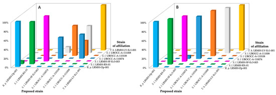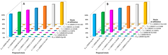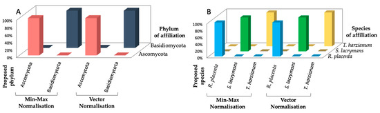 The PLS-DA method performed on the FTIR spectra of mycelia after fungal culture on the PES membrane and direct analysis on the membrane (Figure 4) classifies the spectra with a 100% correct attribution percentage at phylum as well as species level for both data normalisation methods. In the case of min–max normalisation, the percentage of correct attribution is 94.44% at the strain level within the species S. lacrymans. In this case, 16.7% of the spectra of S. lacrymans UBOCC-A-110074 are attributed to strain S. lacrymans UBOCC-A-110108 and 20% of the spectra of S. lacrymans UBOCC-A-110108 are attributed to strain S. lacrymans UBOCC-A-110074. 83.3% of the spectra of S. lacrymans UBOCC-A-110074 and 80% of the spectra of S. lacrymans UBOCC-A-110108 are correctly attributed to each of these two strains, respectively. The percentage of correct attribution is 100% for all strains when vector normalisation is performed, indicating a higher efficiency than min–max normalisation for this sample type (Figure 4).