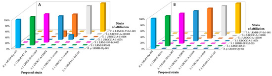 Confusion matrix obtained for the discrimination of the strains after growth in liquid medium. Min–max normalization (A), or Vector normalization (B). R. p., Rhodonia placenta. S. l., Serpula lacrymans. T. h., Trichoderma harzianum.
