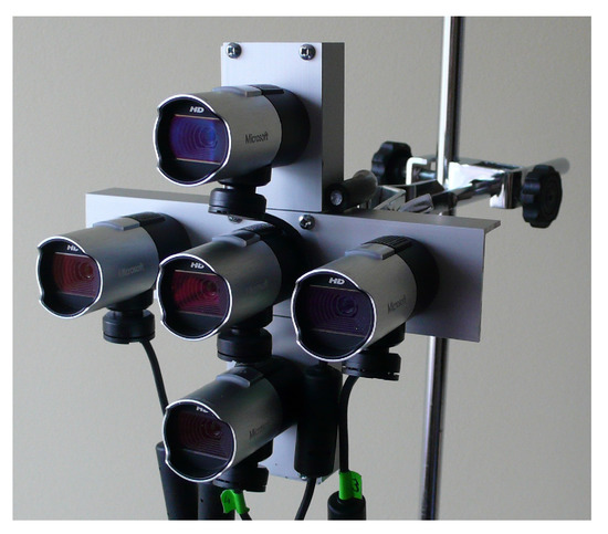 Arrays containing only a few cameras are also constructed and used. Such arrays can be used for 3D imaging instead of stereo cameras without a substantial increase in the size of data which need to be processed due to the increase in the number of images. Park and Inoue proposed the usage of a five-camera array [1]. The array contained a central camera and side cameras. This kind of an array is also considered in this paper, and it is further described in Section 3. Hensler described a similar kind of an array which was constructed from four cameras with three side cameras placed on vertices of an isosceles triangle and a central camera located in the middle [28].