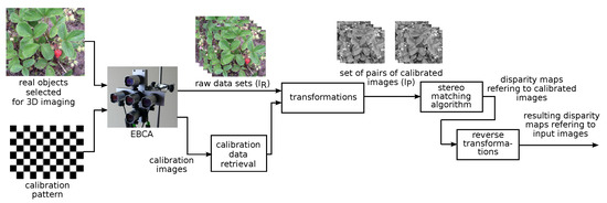 Methods of calibrating and rectifying images described in Section 2.4 do not completely cover transformations which need to be performed in order to calibrate and rectify EBCA. Moreover, techniques based on bundle adjustment are also insufficient because they are designed for other kinds of camera locations as presented in Section 2.4, in which work performed by Hosseininaveh et al. is discussed [52]. In this paper, the stereo camera calibration methods described in Section 2.4 were used. However, in adapting existing stereo camera calibrating methods to EBCA there are two missing steps: The first problem is ensuring that all stereo cameras considered in EBCA will produce a disparity map referring to the same central image, because EBCA is designed to make it possible to easily merge data obtained from different camera pairs. The second problem is calibrating baselines. Solutions for both of these two issues are introduced in Section 4.1 and Section 4.2 of the paper.