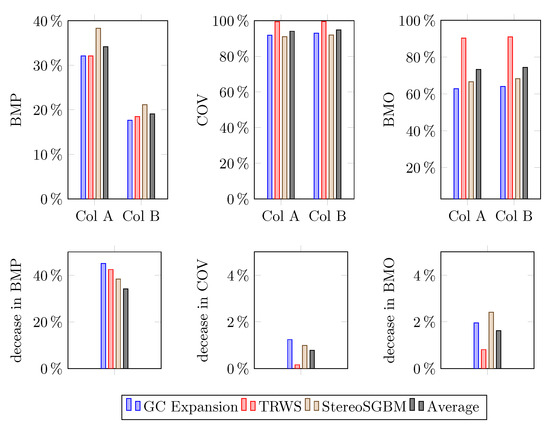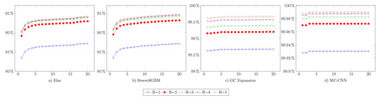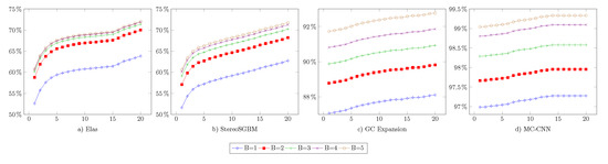Tests presented in this paper considered four stereo matching algorithms considered in Middlebury and KITTI rankings. These are the following algorithms: Efficient Large-scale Stereo Matching (ELAS) [39], Stereo Semi-Global Block Matching (StereoSGBM) [40,41], Graph Cut with Expansion Moves [42] and MC-CNN [12]. Open-source implementations of these algorithms were used in the experiments.