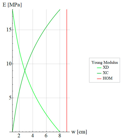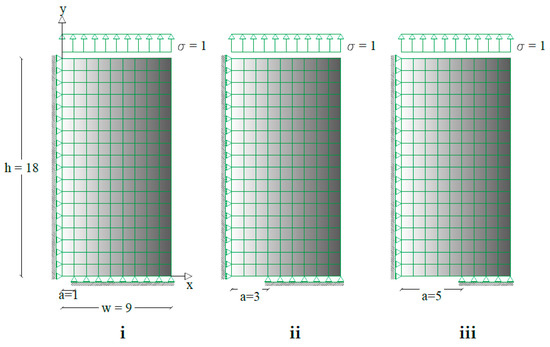 The case study consisted of an FGM plate, in plane strain regime, axially loaded with a uniform tensile load. The plate presented a crack at the center orthogonal to the load direction. The calculation dealt with a quarter of the plate since symmetry of the structure existed. The variability of the elastic modulus was investigated with respect to the stress intensity at the crack tip. The modulus varied with an exponential low between and ; it was assumed that the modulus decreased and increased moving from the crack middle toward the plate edge both in direction of the crack length and in the direction of the applied stress, namely the x and y-directions of the assumed frame. Moreover, three crack lengths were analyzed: 0.11, 0.33, and 0.55 times the plate width, w, Equations (11)–(14).