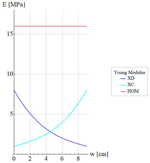 Figure 2 and Figure 3 show the variation of Young Modulus along the x-direction and y-direction. Furthermore, the dark blue and light blue curves indicate the decreasing Young Modulus and increasing Young Modulus , respectively. In the same manner, dark green and light green curves indicate the increasing Young Modulus and decreasing Young Modulus , respectively.