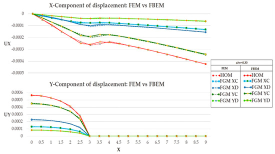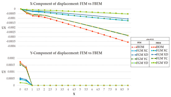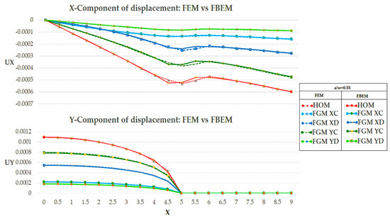 In this section, the solution of the FBEM algorithm is discussed. The Field Boundary Element calculation was compared with a commercial FEM code result (Ansys ©). In the following Figure 4, Figure 5 and Figure 6, the displacement components along the x-direction and the y-direction are shown for the three different crack lengths together with the FBEM results. It can be seen that FBEM and FEM produced the same displacements.