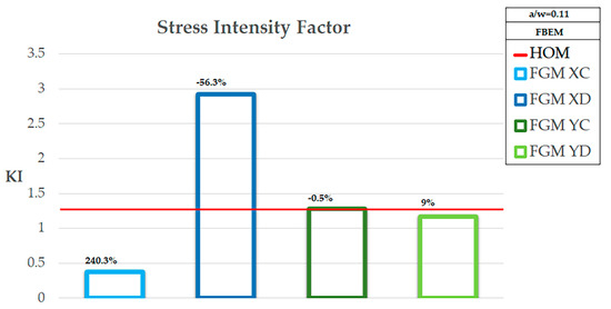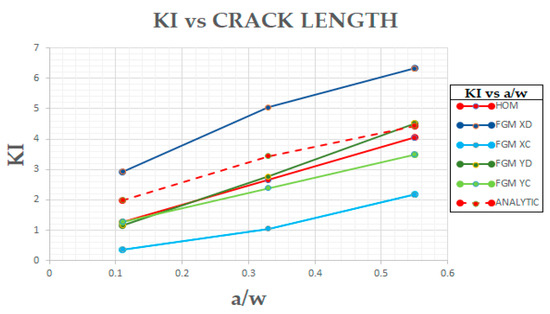 The stress intensity factor KI is reported in Table 1. The reported results allowed a comparison between the analytical results for the homogeneous infinite plate through Equation (15).