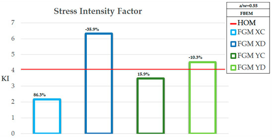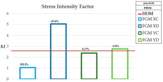 A final consideration suggested that the numerical calculation showed the feasibility of the method that allowed the application of integral equations to fracture mechanics even in the cases of heterogeneous materials; moreover, it was shown that the variability of the mechanical properties of the structure affected the value of the SIF. The qualitative behavior of the KI can be seen in Figure 8, Figure 9, and Figure 10 where the bars and the percentage variation (%V) of the KI were delimiting values of the homogeneous case provided the variation developed in the x-direction. Conversely, when the variation followed the y-direction, the behavior was quiet in comparison to the homogeneous one.