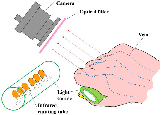 Biometric technology combines computers with high-tech approaches, such as optics, acoustics, biosensors, and biostatistics principles, and uses the inherent physiological characteristics of the human body (fingerprints, iris, gait, veins, etc.) to confirm a person’s identity [11,12,13,14]. Traditional identification methods include identification items (keys, certificates, ATM cards, etc.), and security information (such as usernames and passwords). However, because these methods mainly rely on external objects or memory, once the identification item or security information that proves identity is stolen or forgotten, the individual can be easily impersonated or replaced by others. Biometrics is more secure, confidential and convenient than traditional identification methods. Biometric identification technology has several advantages: it does not require memorization, has good anti-counterfeiting performance, is difficult to forge or steal, and is “carried” with the individual, and is usable anytime, anywhere. Among these techniques, vein recognition technology [15] is highly effective against counterfeiting. Veins are hidden in the body, and are inherent features that are difficult to forge and steal. Vein authentication is a second-generation biometric recognition technology [16], with great application prospects and development opportunities in security fields.