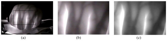 Infrared light serves as the experimental light source. The light source was held in the palm and the camera was located on the other side. The light source was turned on and video images of the light transmitted through the hand were recorded. A 20 s video was obtained, from which 400 image frames were extracted. Since the data obtained in the initial stage of acquisition may be unstable, 300 frames of the intermediate acquisition stage are selected for experimental data processing and analysis, one of which is shown in Figure 2a. The region of interest (ROI) was determined, and the corresponding interception for each frame was performed to obtain the image corresponding to the ROI, which is expressed as (i = 1, 2…m, m = 300), as shown in Figure 2b. A gray-scale operation was performed to obtain a single-channel image corresponding to the ROI, denoted as , one of which is shown in Figure 2c.