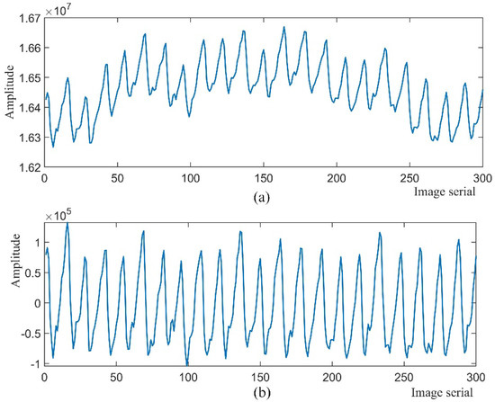All pixels in each frame of ROI image () were accumulated to obtain the feature value of each frame. All feature value points constitute a one-dimensional pulse wave signal (i = 1, 2…m, m = 1000). The schematic diagram is shown in Figure 3.