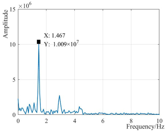 The full-period pulse wave signal is determined by peak-to-peak value detection, and the full-period FFT is further performed on the obtained pulse wave signal. The frequency domain diagram of the pulse wave is shown in Figure 5. Then, the heart rate value is determined by the maximum frequency ratio in the frequency chart, the maximum frequency () = 1.467 Hz, that is, the corresponding heart rate (HR) = f × 60 = 1.467 × 60 ≈ 88 bpm.