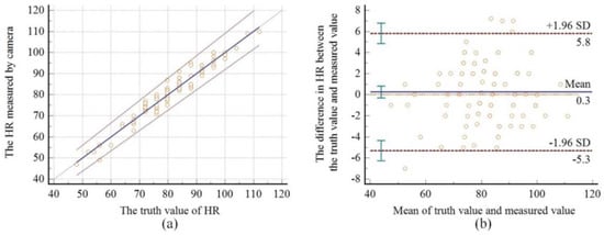 Bland-Altman diagram. (a) The regression line between the true heart rate and the measured value of camera: the abscissa represents the true heart rate, and the ordinate represents the value measured by the camera; (b) the level of consistency between the true heart rate and the value measured by the camera: the abscissa represents the average difference between the true heart rate and the value measured by the camera, and the ordinate represents the difference between the true heart rate and the value measured by camera.