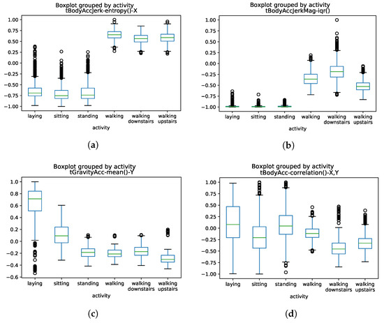 Boxplots for four features of the dataset grouped by activity. (a) Entropy of the x-axis jerk signal of the body acceleration. (b) Interquartile range of the jerk signal magnitude of the body acceleration. (c) Mean of the y-axis signal of the gravity acceleration. (d) Correlation between x- and y-axis signals of the body acceleration.