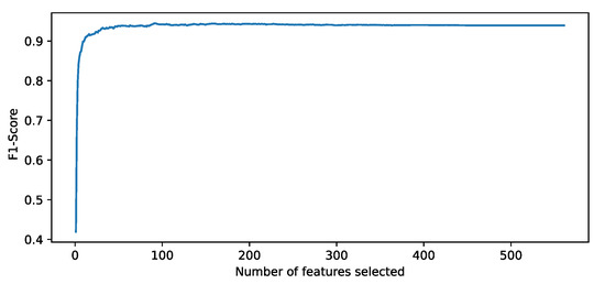 The data recording, preprocessing and feature extraction necessary to get reasonable results from machine learning is already done by the UCI HAR Smartphone dataset [31] (see Section 3.3). As a first step, to understand the dataset, different plots like bar charts to indicate class distribution or boxplots per activity to understand distribution of features for different activities are used (see Section 3.3.3). Given the dataset comes with 561 extracted features, the next step is to find an optimal amount of features that can represent the data in the best way. For this, we use recursive feature elimination (RFECV) with stratified 10 fold cross validation and a baseline classifier. Figure 3 shows the performance of the baseline classifier depending on the amount of features used. Ninety-one is the amount of features achieving the best performance and those features are therefore used to train the models. This figure also shows that there is potential to decrease the amount of features, and by that also the complexity, even further. To find a well performing model, several classifiers (see Section 3.4) are used and evaluated over a certain range of hyperparameters. To find the leading model with its best hyperparameters, a grid search with 10 fold cross validation is employed. For each of the evaluated classifiers, the best configuration is then tested against the held back test set and the performances can be compared to each other. The best of those typical machine learning models will then be compared to the deep neural nets.