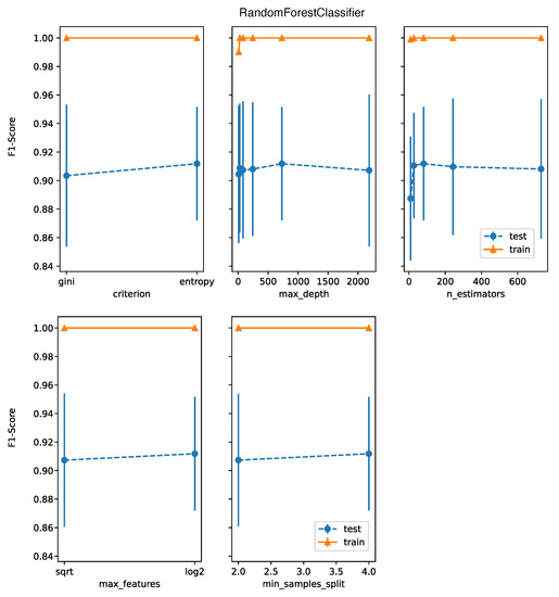 For the Random Forest Classifier, the hyperparameter ranges depicted in Table 4 were evaluated. Figure 4 shows the results of this evaluation. As the evaluation was done by running a grid search over the defined hyperparameters, many different combinations are trained and therefore for each of the hyperparameters, multiple models are trained. The mean performances of the models with a certain value of the hyperparameter are displayed in a subplot for each of them. Intuitively, the most important factors to influence the performance of a Random Forest would be the number of trees it consists of and how deep these individual trees can go. This is also partially in line with our results, where the most performance is gained by finding the best amount of trees (n_estimators) with 81. The other evaluated parameters, the maximum allowed depth, the maximum number of features per tree, the minimum needed samples to split a tree and the criterion function to measure the quality of a split did result only in smaller gains. Across all of the models and parameters, there is a very big spread of performances visible by looking at the error bars on the test performances showing the standard deviation. This could indicate that finding a certain combination of hyperparameters that work well together is very important.