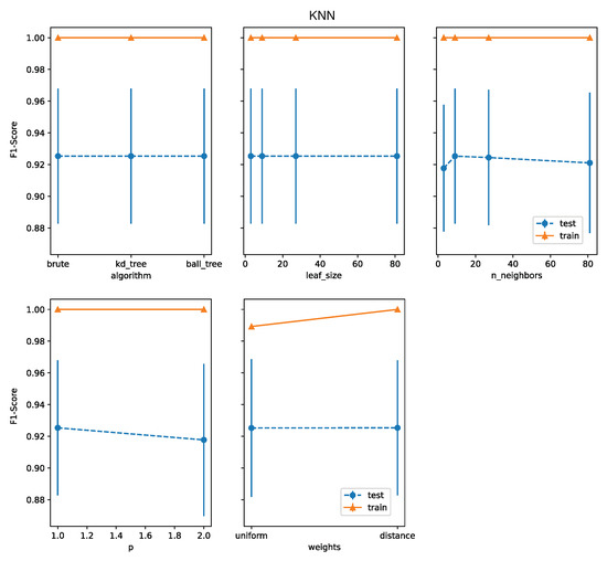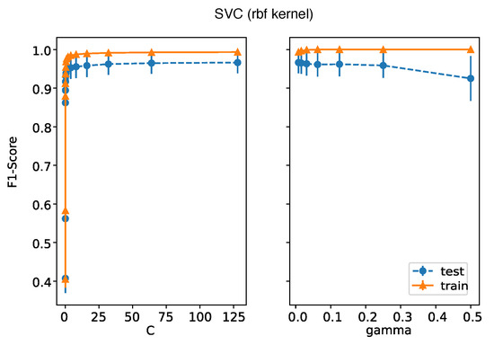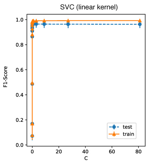 For example the cost (C) of the support vector classifier with the RBF kernel seen in Table 2 is evaluated in a range of to , which means , , and so on are evaluated. The hyperparameter selection including their ranges for the linear kernel SVC can be found in Table 3. Contrary to the SVC models, the criterion of the random forest model seen in Table 4 is evaluated as both gini and entropy. Finally, the hyperparameter definitions for the KNN model can be inspected in Table 5.