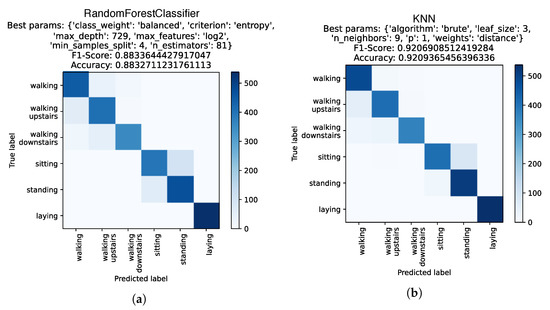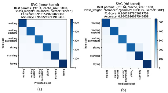 Confusion matrices of the best performing SVM models with its hyperparameters. (a) Support Vector Machine (linear kernel). (b) Support Vector Machine (RBF kernel).