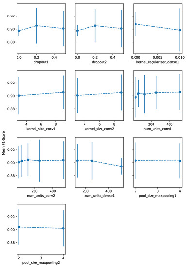 As a short recap, the architecture of the CNN we saw in Table 6, consists of two one dimensional convolutional layers each followed by a dropout layer and a max pooling layer. In the end, a flattening layer puts everything in one dimension and two dense layers reduce to the output shape of our six labels. Figure 10 shows the mean performances of models, trained with a certain hyperparameter, with its standard deviation on the test data. Starting with the plot for num_units_conv1, the number of units of the first convolutional layer, it can be seen that there is a trend towards more units providing better peak performance. Interestingly, for the value of 64, the models tend to have a lower spread of performances visible in the lower standard deviation bars. Leading to the conclusion that for this number of units, the tradeoff between underfitting and overfitting is the best as there are fewer outlier performances and the models seem to consistently perform well. For the number of the units of the second convolutional layer num_units_conv2 this general trend of increasing peak performances is also visible. In this case, the value of 128 seems like the best available tradeoff as it performs better than the lower values but does not bring too much more complexity to the model that could make it overfit more. The same value also seems favourable for the number of units of the dense layer, num_units_dense1.