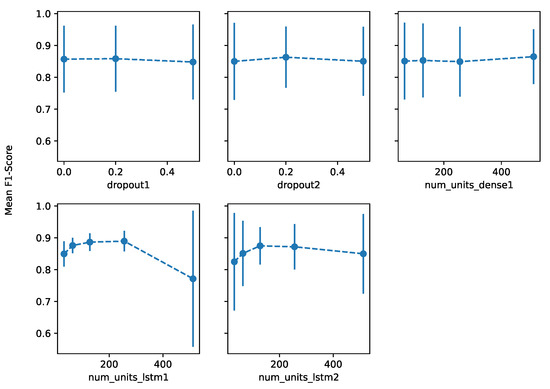 To tune the RNN architecture, as previously explained in Table 7, the five hyperparameters visible in Figure 11 have been evaluated as they are expected to change most of the behaviour. The leading two hyperparameters in terms of influence on the performance of the models are num_units_lstm1 and num_units_lstm2, the amounts of units of the two LSTM layers. For both of these parameters, there is a very interesting trend visible at the highest evaluated value of 512, where the trained models have the potential for very high highs but also for very low lows as can be seen by the comparably lower mean values and the comparably high standard deviations. This indicates that the models using these higher values tend to be too complex to generalize well enough as they can accidentally perform very well for the test set or just the opposite. Given this fact, we view 128 as the most promising value for the number of units of both LSTM layers. In order for the model to be less likely to overfit, two dropout layers that disable a certain rate of the neurons of the previous layers have been added after each of the LSTM layers. The performances of models with different dropout rates for dropout1 and dropout2 show that they do not have as much effect on the RNN as they have on the CNN. The second dropout layer has its best effect when using a dropout rate of 0.2 or 20%, even though small. For the last evaluated parameter num_units_dense1, the number of units of the first dense layer the results do not differ that much. To be in line with the number of units of the LSTM layers, we choose the value of 128 going forward.