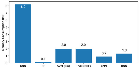 Looking at current smartwatches, memory consumption is not as much of an issue anymore. For example, the Apple Watch Series 5 and onwards already comes with 1 GB of RAM and the Samsung Galaxy Watch 3 already has 1.5 GB of RAM. Therefore developing a mobile app or smartwatch app to deploy HAR machine learning should be no problem. Of course, if you want to create your own wearable device, the memory consumption might matter a bit more if you want to shrink the hardware or to increase battery life. Using the setup explained in Section 3.1, we record the memory usage and arrive at the results visible in Figure 12.