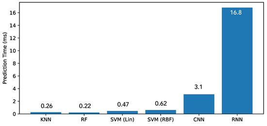 Another metric we capture using the same method (see Section 3.1) as for the memory consumption is the mean prediction time. Figure 13 shows the results of this experiment with the mean prediction time in milliseconds for each of the best models on a random collection of samples. Clearly, the RNN takes the longest to arrive at a prediction with 16.8 ms. Of course, 16.8 ms would still be acceptable in terms of user experience, but as the other models show, it also can be done quite a lot quicker. Another factor to consider here is that these times are achieved on an iPhone XR, which has more processing power than a typical smartwatch or wearable, which might mean that when running on a smartwatch, the RNN could already be too slow for a given use case. The CNN for example does not even need a quarter of the time with 3.1 ms. When training RNNs, it quickly becomes apparent that they take lots more time to train than for example CNNs. Convolutions can be done in parallel, because to calculate the result of one kernel, only a few neighbouring values are needed, but for an RNN, much of the work needs to happen sequentially, as outputs depend on previous outputs. This is why it also makes sense that this applies when predicting a sample. When looking at the machine learning models, one of the advantages of simpler models becomes quite clear. With the KNN and the RF being the quickest models with 0.26 ms and 0.22 ms respectively and the SVMs being a little bit slower with 0.47 ms for the linear version and 0.62 ms for the RBF version.
