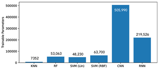 With the memory consumption and mean prediction time in mind, we can look at our third metric for model complexity, the number of trainable parameters. As mentioned, for the machine learning models, we approximate this number by using the formulas defined in Section 3.1. For the KNN, it represents the number of samples used as training data (see Equation (1)). To calculate the value for the Random Forest, Equation (2) is used and it is based on the sum of nodes of the trees. Finally, for the SVM, the number of trainable parameters is estimated using Equation (3) and it is based on the number of trained support vectors and the number of features. Having defined these formulas, Figure 14 shows the results of the calculations for the best machine learning models and the values for the best CNN and RNN that can be easily obtained from the model summary. The results are in line with what we would intuitively expect when thinking of the complexity difference of these models, with the deep neural nets being much more complex with 505,990 parameters for the CNN and 219,526 parameters for the RNN. In contrast to that, the RF and SVMs are similar with the RF at 53,063 parameters, the linear SVM at 48,230 parameters and the RBF SVM at 63,700 parameters. The simplest model according to this approximation is the KNN with 7352 parameters. With these and the previous results in mind, we can clearly see that the effect seen in the previous results that are mostly determined by the architecture of the model are not as visible here. For example, the KNN is the simplest model and it is also very fast in terms of prediction time, but it still has the highest memory footprint. The RNN on the other hand looks to be less complex in this figure, but as we have seen, it is the slowest by quite some margin. Nevertheless, it gives a good initial indication of how these models relate to each other. However, when it comes to adhering to specific requirements of a use case it makes sense to use a metric closer to what is actually the most important factor to determine the applicability, be it memory consumption or prediction time or any other metric.