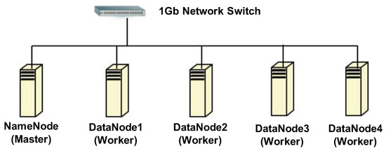 Figure 1 shows our testbed cluster consisting of one namenode (master) and four datanodes (slaves). In the namenode (master), we configured the NameNode and Secondary NameNode of Hadoop (HDFS) and the Driver Node (master node) of Spark. In each datanode, we run the DataNode of Hadoop (HDFS) and Worker Node of Spark. The namenode and datanode machines have the same H/W environments (3.4 GHz Xeon E3-1240V3 Quad-Core Processor with hyper-threading), except for the amount of main memory (8 GB for the namenode and 4 GB for each datanode). We used two SSDs as storage spaces where a 120 GB SATA3 SSD is used for the operating system, and a 512 GB SATA3 SSD is equipped for the HDFS, respectively. In addition, the 512 GB SATA3 SSD can be effectively leveraged for expanding the bandwidth of insufficient main memory to cache the RDDs of Spark. All nodes including namenode and datanode are connected with a 1 Gb Ethernet switch, as seen from Figure 1. Table 2 shows the summary of hardware and software configurations in each datanode of our testbed cluster.