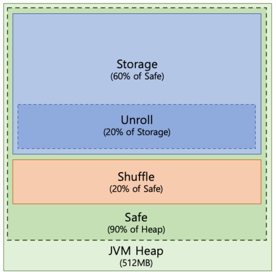 In the default Spark configuration, the storage and shuffle spaces of the JVM heap have capacity fraction ratios of 0.6 and 0.2, respectively (i.e., 60% of safety area for the storage and 20% for the shuffle). The unroll space takes 20% of the storage space by default. The capacity of these three spaces of JVM heap can be set by spark.storage.unrollFraction, spark.storage.memoryFraction, and spark.shuffle.memoryFraction. For example, in our testbed cluster, we can set the spark.executor.memory as 2.6 GB of the 4 GB memory of the worker node, which means that the JVM heap size is set to a maximum of 2.6 GB. Then, the actual capacities of storage space and shuffle space are 2.6 GB × 0.9 × 0.6 = 1.4 GB and 2.6 GB × 0.9 × 0.2 = 0.46 GB, respectively. Accordingly, the unroll space takes 1.4 GB × 0.2 = 0.28 GB.