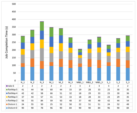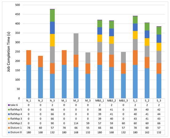 Figure 3 shows the experimental results of each stage in the PageRank workload by changing the JVM heap sizes. In the Distinct stage, Spark reads the input data and distinguishes the URL and links. As we can see from the results of the Distinct0 stage, the overall execution time decreases by changing the JVM heap sizes from _1 and _2 to _3 options, mainly due to the garbage collection (GC). For example, the GC time takes 25 s, 24 s, and 16 s in M&S_1, M&S_2, and M&S_3, respectively. Therefore, in the Distinct0 stage, as we increase the amount of storage space, we can improve the overall performance by reducing the GC time. On the other hand, in the Distinct1 stage, the overall execution time increases as we change the options from _1 and _2 to _3. This is mainly because of the shuffle spill. When we checked the Spark web UI, the shuffle data were spilled onto the disk because of the lack of shuffle memory space. For example, the sizes of shuffle spill data on disk in M&S_1, M&S_2, and M&S_3 are 0, 220 MB, and 376 MB respectively. When the shuffle spill occurs, the CPU overheads for spilling the data onto the disk increase because the data need to be serialized.