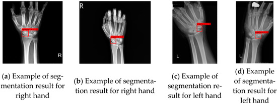 Traditionally, a CNN uses a sliding window to filter the features for the whole image. However, in our context, the recognition quality is limited when using the whole image. This is because the scaphoid bone is only a subarea of the image. Considering this issue, in this paper, the scaphoid bone was extracted from the image before training and testing, that is, the scaphoid bone is regarded as an object, which is segmented to narrow the recognition space from the whole image to a subimage. In this paper, the object detector used is YOLO-v4 (You Only Look Once-version 4) [32], which is an efficient and effective method extended from YOLO-v3 [33]. In the related literature, YOLO-v4 is composed of three main parts, namely a backbone, neck, and head, where the backbone is CSPDarknet53 [34], the neck contains SPP [35] and PANet [36], and the head is YOLO-v3. Note that, for the segmentation in this paper, the number of training instances was 408 and the accuracy was around 96%. Figure 3a,b show examples of segmentation results for right hands, while (c) and (d) are those for left hands. All successfully segmented images were considered as the experimental data. In the segmented data, the maximum height and width were 353 and 264, respectively, while 94 and 71 were the minimum height and width, respectively.