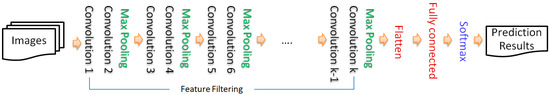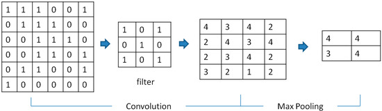 Advanced hardware technology has enabled the rapid growth of artificial neural network technology. They can simulate the human brain to recognize images, as is the case for CNNs. The basic idea is that a CNN performs feature filtering by convolutional computation and pooling. Then, through flattening, full connection, and softmax activation, the prediction probabilities for each class are output. Figure 5 depicts the framework containing convolution sets, maximum pooling sets, flattening, a fully connected layer, and a softmax activation function. Figure 6 illustrates the convolution, which indicates that a convolutional map is generated by sliding dot product computations between an image and a filtering map, while the maximum pooling indicates that a map is generated by maximizing the region features from the convolutional map. In this paper, we compare five NNs: VGG [37], ResNet [38], DenseNet [39], InceptionNet [40], and EfficientNet [41].