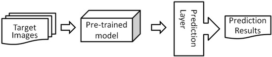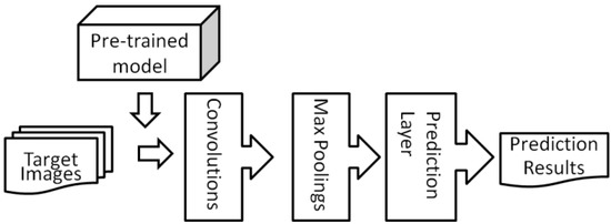 In addition to data augmentation, transfer learning has been proposed to increase the recognition effectiveness when facing insufficient data. The basic notion is to reuse a pre-trained model to enhance the prediction ability. In this paper, two paradigms of transfer learning are utilized, namely layer transfer and fine-tuning. For layer transfer, as shown in Figure 7, the network is initialized by the pretrained model. Next, feature filtering is skipped, and only the prediction layer is trained by the target images. For fine-tuning, as shown in Figure 8, the whole network is initialized by the pretrained model. Then, the feature filtering and prediction layer both keep working with target images. Therefore, the network is tuned based on both the pretrained model and target images. In this paper, the fine-tuning-based transfer learning is performed with VGG networks, while the layer transfer-based learning was performed for the other networks.