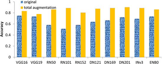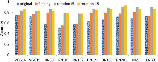 The first result to assess, in terms of the problem of insufficient data, is the impact of data augmentation. Figure 9 shows the effectiveness of different models with different data augmentations. In these results, different data augmentation types had different impacts for each model. On average, the performance rank for three augmentation types were rotation 15°, rotation −15°, and flipping. Overall, for any of the individual augmentations, the performance was better than that without augmentation (denoted as “original”). Besides the individual augmentations, further comparison between those with and without augmentations was made. Figure 10 reveals the results in a manner similar to that of Figure 9. Three viewpoints for the results are shown here. First, the accuracies of VGG Nets and EfficientNets did not improve significantly. Second, the best improvement was for RN101, which reached an improvement rate of approximately 73%. Third, the potential interpretation for the difference in effectiveness of augmentation on different models is that the model architectures were sensitive to data augmentation, considering the pre-trained model. In detail, the residual idea works well for ResNets and DenseNets. This is also the main contribution to discerning the difference among AI Nets. Fourth, on the whole, most models were enhanced through data augmentation. Note that this evaluation was carried out based on the settings presented in Table 3.