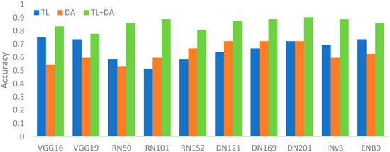 Figure 11. Accuracies of compared CNNs by considering transfer learning (termed TL), data augmentation (termed DA), and fusion of TL and DA (termed TL+DA). - In addition to the four observations mentioned in Section 4.4, another point to show is the performance comparison in terms of the AUC. Figure 12 reveals the AUC comparisons of models with accuracies larger than 0.9, namely RN50, RN101, DN121, DN201, INv3, and ENB0. Basically, it can be divided into two observation spaces, by the line where the false positive rate (FPR) equals 0.1. Before FPR 0.1, DN121 is better than the others. To the contrary, the performances of RN101 and DN201 are relatively close but higher than those of the other models, after FPR 0.1. Overall, RN101, DN201, and INv3 are the highly considerable models, in terms of the AUC.