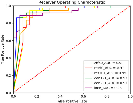 Figure 12. AUCs of models with accuracies larger than 0.9. - Besides the AUC, a further comparison to show the interdiscrimination ability of TP, TN, FP, and FN for each model is the hybrid validation, which indicates the average of the F1-score, AUC, and kappa metrics. Figure 13 depicts the validation result, showing that the top three models were DN201, DN169, and RN101, although their values were close. This result is consistent with those given above. However, by considering the overall performances in Table 8, the best two models for recognizing scaphoid fractures are DN201 and RN101.