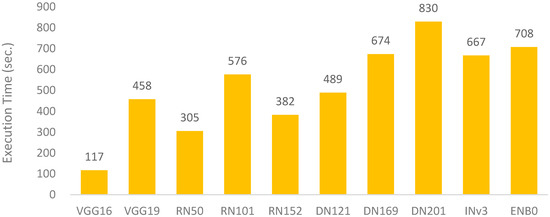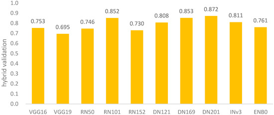 Figure 13. Hybrid evaluations by averaging F1-score, AUC, and kappa metrics. - In addition to the effectiveness evaluation, another important issue is the efficiency. Considering this issue, Figure 14 shows the execution time of compared models. The comparison result revealed that DenseNet, InceptionNet, and EfficientNet had higher costs than the other models. By integrating the results of Figure 13 and Figure 14, three further viewpoints are given here. First, from the effectiveness point of view, DN201, DN169, and RN101 are three candidate models. Second, from the efficiency point of view, VGG16, RN50, and RN152 are three candidate models. Third, from a balanced viewpoint, the top three models are VGG16, RN50, and RN152 because the referred balances between test performance and training cost are higher than that of the other models. Overall, DN201 and RN101 are the considerable recommendations, due to three aspects. First, the training operation would not be performed frequently. Second, the testing quality is more important than the training cost in the field of bioinformatics. Third, in the experiments, the recognition for each model could be carried out within 1 s. Hence, the testing quality was our major consideration in determining the recommendations.