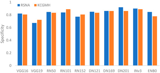 Figure 15. Specificity comparisons of using RSNA data and KCGMH data for the recognition models. - In summary, the above experimental results provide evidence that DenseNet and ResNet perform better than the other three networks. From these two networks, DN201 and RN101 are further selected as the recommended recognizers because the overall performances are better than the others in these two networks.