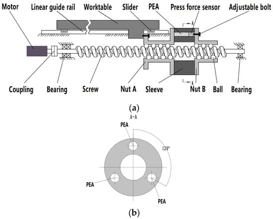 For the purpose of realizing variable (automatically adjustable) preload force control, a system using PEAs is proposed. The schematic diagram of the variable preload force ball screw system is shown in Figure 1, in which the master nut (connected to the worktable) and the slave nut are defined as Nut A and Nut B, respectively. Between Nut A and Nut B, three PEAs and three press force sensors are evenly distributed along the circumference of the sleeve. Due to the fact that the PEAs cannot withstand the shear force and tensile stress, it is our objective to design the system in such a way that the adjustable blots apply the initial preload force on the PEAs in axial direction to avoid the damage. In addition, these three parts are mounted evenly separated as depicted in the sectional view.