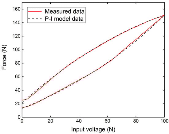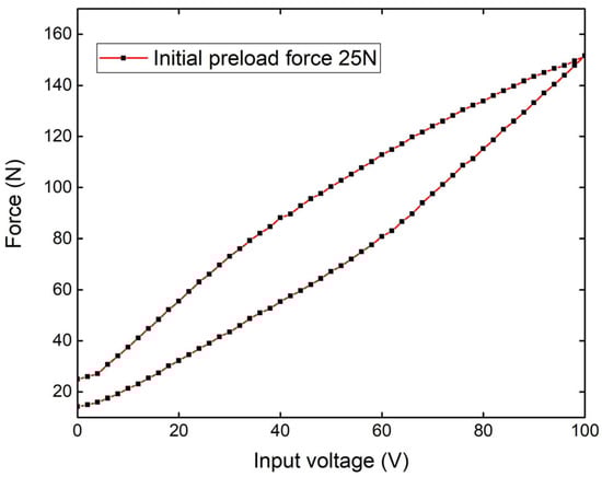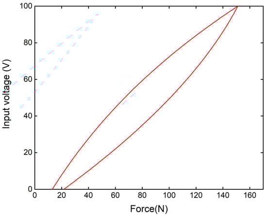 Under practical conditions, the input–output characteristic curve shows the obvious nonlinear hysteresis error of PEAs. In the experiment, the initial preload force (the force applied by the adjust bolt) is 25 N, and the measured curve can be seen in Figure 4. In this work, the change in the curve shapes of the hysteresis loop under different external loading conditions is neglected. Considering the control strategy of the proposed structure, it is believed that the general linear control method is not able to meet the requirements of the system due to the nonlinear characteristic of the PEAs in this work. To achieve the feedforward compensation for the hysteresis error, a nonlinear hysteresis fitting model on the basis of a mathematical method needs to first be established, and the inverted model can be solved accordingly to obtain the relationship between the input voltage and the output force of the PEAs. This means that the more accurate the fitting model, the better the compensation effect; however, more parameters of the model need to be determined. As a result, a large amount of experimental data is required to identify the various parameters in the model. All in all, the above two methods have their own limitations: the feedforward control is greatly reliant on the accuracy of the modeling and there is a lack of resistance to unknown disturbances; moreover, the response time of the feedback control is relatively long.