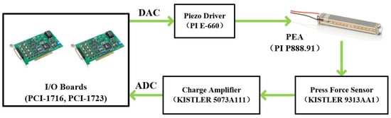 The control system for the automatic adjustment of preload force is shown in Figure 7. To verify the effectiveness of the proposed control model, the experiments are conducted using three commercial PEAs (Physik Instrumente, Lederhose, Germany, P-888.91). In addition, the range of the input voltage is set between 0 V and 100 V. The press force sensors (Kistler, Winterthur, Switzerland, Type 9313AA1) are respectively connected to the PEAs. Two I/O boards (Advantech, Taiwan, China, PCI-1716, PCI-1723) are used to transmit the data. The control model and data saving are programmed in Labview. The piezo driver is a low-cost amplifier for low-voltage PEAs. In addition, the system schematic connection is shown in Figure 8.