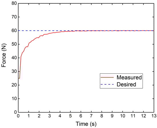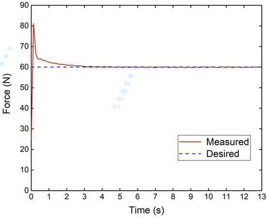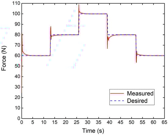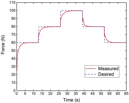 In the experiment, the initial preload force is set as 25 N, and the desired force is 60 N. The PID controller gains used for the experiment are set initially with empirical tuning estimation to be = 0.3, = 0.08, = 0.001. The input voltage range of the closed loop force output control system is 0–110 volts, and the tracking response of the system is shown in Figure 10. On the basis of the results of the test, the rise time, peak time and settling time are 1.69 s, 3.38 s, and 3.38 s, respectively, when the error of the response is selected to be 1.5 N. Additionally, the tracking response of the step control with the trajectory (60 N-80 N-100 N-80 N-60 N) is also tested, with results shown in Figure 11.
