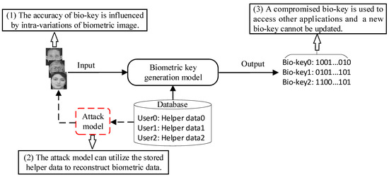 With the rapid development of biometrics-based recognition technology, biometric images (e.g., face, iris, fingerprint, iris, retina) can be adopted to generate a biometric key (bio-key), which is used as a user’s physical identity in the fields of IoT, blockchain, and cloud computing [1,2,3]. In recent years, people have paid more attention to the privacy and security of biometric data. Once the bio-key generation system exposes biometric data, attackers can utilize this data to access the server for stealing the user’s private information, which leads to sensitive information leakage and financial loss. In addition, biometric data is permanently associated with the user’s natural identity, thus revocation of the user’s biometric trait is impossible [4]. Therefore, for a secure and reliable bio-key generation approach, there are three main issues to be solved. As shown in Figure 1, these issues are as follows: