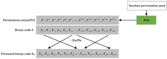 Random permutation can shuffle the elements of binary code, which can obtain different bio-keys. On the one hand, once the generated bio-key is compromised, a new bio-key can be easily regenerated by only modifying the random permutation seed. On the other hand, it can reduce the cost-time of bio-key generation instead of retraining the DNN model. PV is firstly produced by RNG with random permutation seed for each user, let the produced , which satisfies . Given a binary code with length where , a permuted binary code is obtained by randomly shuffling the elements of K according to PV. In addition, PV is stored in the database during the enrollment stage. It can be observed from random permutation that PV does not reveal any information of the binary code or bio-key. This is because that PV is only determined by random permutation seed and has no relationship with binary code. In the bio-key reconstruction stage, the permuted binary code is generated by only shuffling the elements of query binary code through the stored PV in the database. As shown in Figure 5, we give an example of random permutation when= 256.