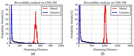 To further illustrate the accuracy performance of our methods, we compare our approach with other state-of-art methods [15,64,65,66] on Extended YaleB and CMU-PIE dataset. Table 2 and Table 3 show the comparison results on the Extended YaleB and CMU-PIE datasets, respectively. On the one hand, our method can earn a GAR of 99.40% for 128 bits binary code, which outperforms the Genetic-ECOC method [64] at GAR at a fixed 1% FAR on the Extended YaleB dataset. On the other hand, references [64,66] may perform extremely well; they are close to our performance. However, their lengths of the codeword are both less than 90, and as such they offer lower security to brute force attacks. In Table 1, we can find that the GAR and EER of our method are 99.97% and 1.49%, respectively, for a length size of 128 on the CMU-PIE dataset. Thus, our algorithm outperforms reference [65] even if our length of the codeword is less than [65]. In summary, our method can achieve a higher GAR and a lower EER than Hybrid [65], BDA [66], MEB coding [15], and Genetic-ECOC [64] on the CMU-PUE dataset. The reason is that our proposed scheme adopts the DNN model based on feature extraction network and binary code mapping network to generate robust binary code, which can enhance the compactness of intra-class and discrepancy of inter-class. Our proposed method can effectively perform better accuracy than the state-of-the-art methods under the intra-user variations such as illumination, pose, and expressions. Therefore, our approach can enhance stability under the multi-shot enrolment.