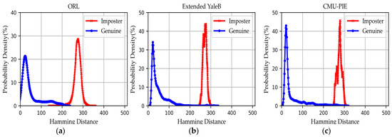 In this experiment, we train the DNN model during the enrollment stage on ORL, Extended YaleB, and CMU-PIE datasets, respectively. Before training our DNN model, we adopt the MTCNN [63] model to implement image alignment operation, and then take the center crop operation to generate the final face image of 112 × 96 from the aligned image so that the input size to the network is consistent. After the alignment and crop operations, we train our DNN model to generate bio-keys from the pre-processed face images. In the training process, , , and are set to 0.25, 0.25, and 0.5. The batch size is 64 and the learning rate is 0.0001. We use a SGD optimizer to train our network with 80,000 epochs. It is noted that five different trained DNN models are generated by only modifying the output dimension of the FC_3 layer. Then, these cropped images are fed into the trained DNN models to generate 128-, 256-, 512-, 1024-, and 2048-bit binary codes. Next, these binary codes produce PV and AD for registering into the database. In the reconstruction stage, test images are submitted as the inputs of the bio-key generation model for testing. Our experiment environment is: Window10, 64 bits, CPU: and Intel(R) Core(TM) i7-9750H. In addition, all verifications of our proposed scheme are implemented in Pycharm IDE.