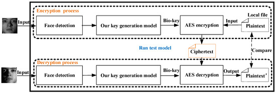 As is shown in Figure 9, we give the encryption and decryption process. Our test model consists of face detection, key generation model, AES encryption, and decryption modules. In the encryption process, we adopt the USB camera to obtain a face image of the user; then, this face image is detected through the face detection module by MTCNN. Next, a bio-key is generated by our trained key generation model. At the same time, the plaintext is submitted as an input of the AES encryption module. Finally, we perform data encryption with the inputs of the bio-key and plaintext to yield a ciphertext. In the decryption process, we also obtain different face images of the same user to regenerate the bio-keys, which are used to decrypt the ciphertext for generating plaintext. Therefore, we compare the data consistency.