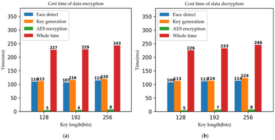 In the aspect of time consumption, the cost time of data encryption and decryption is shown in Figure 10. The face detection and key generation modules account for nearly half of the total time consumption for the key lengths of 128, 192, and 256 bits. This is because these two modules both adopt DNN architecture, thus they are more time-consuming than the AES encryption module. In general, the time for once encryption and decryption is within 250 ms on this application. Specially, the time of key generation is less than 130 ms of 128, 192, and 256 key lengths. For the data encryption application, this cost consumption is worthwhile, and our scheme is effective and practical for real-world bio-key applications.