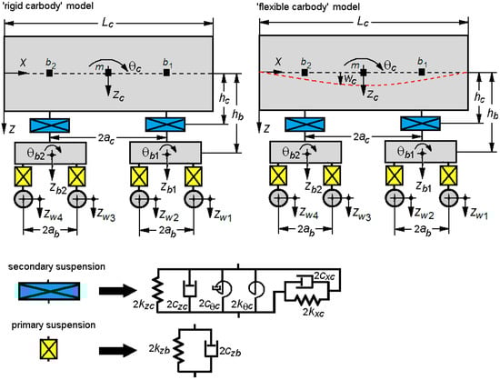 For the proposed study, a four-axle vehicle with two suspension stages travelling at a constant velocity V on a track with vertical irregularities is considered. The two vehicle models—the ‘rigid carbody’ model and the ‘flexible carbody’ model, shown in Figure 1 []—have several elements in common. Both models comprise seven bodies representing the carbody, the suspended masses of the two bogies and the four axles connected to each other by Kelvin-Voigt type systems, helping to model the two stages of suspension. Both bogies and axles are represented by rigid bodies.