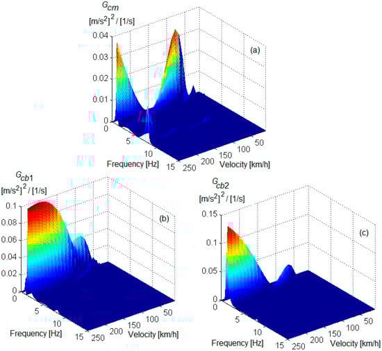 To analyse the vertical vibrations behaviour of the vehicle carbody, we utilised the power spectral density of acceleration in three important points considered critical points of the vibrations level of the carbody and the ride comfort in the railway vehicles [,]. These reference points are marked in Figure 1 and found at the centre of the carbody—point m—and against the support points of the carbody onto the secondary suspension, above the bogie 1—point b1—and above the bogie 2—point b2.