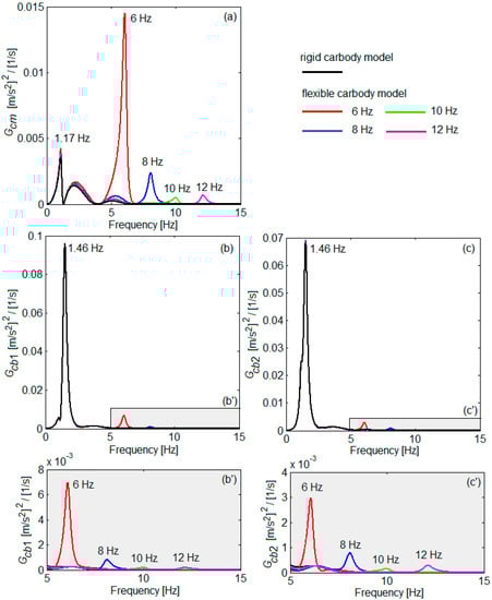 To evaluate the influence of the vertical bending upon the of the vertical vibration behaviour of the carbody, the diagrams in Figure 3 are utilised, showing the power spectral density of the vertical acceleration at the velocity of 180 km/h for both the ‘rigid carbody’ model and the ‘flexible carbody’ model. For the ‘flexible carbody’ model, four values of the carbody bending frequency were considered, namely 6 Hz, 8 Hz, 10 Hz and 12 Hz. What can be noticed in the diagrams are the peaks for the four resonance frequency of bending and the ones corresponding to the vibration rigid modes—the resonance frequency of the carbody bounce and the resonance frequency of the carbody pitch. Apart from these resonance peaks, a series of anti-resonance frequencies can be identified due to the geometric filtering effect [,,,,].